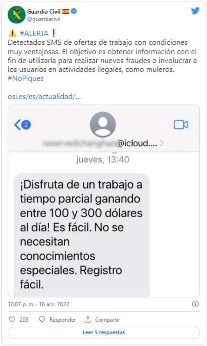 El phishing tiene un campo de actuación amplio. Podemos encontrar el envío de un SMS que ofertan trabajo con unas condiciones de sueldo de entre 100 y 500 € diarios, cuyo objetivo principal es disponer de los datos de los estafados. La Guardia Civil twitteó alertando sobre este tipo de fraude.