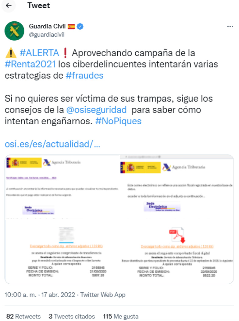 También encontramos que mediante el uso de técnicas TTP (tácticas, técnicas y procedimientos) los ciberdelincuentes realizan un fraude aprovechando el comienzo de la campaña de la renta. Este es uno de los casos más habituales de Phishing en la que los estafadores suplantan la identidad de la Agencia Tributaria para engañar a sus víctimas, informándoles de una supuesta devolución de su declaración de la renta.