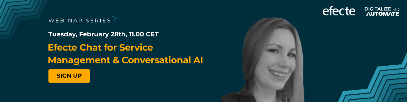 Te invitamos a nuestro Webinar el próximo 28 de Febrero a las 11.00 CET, donde Ewa nos hablará de cómo Efecte Chat for Service Management (ECSM) y nuestros otros productos de automatización conversacional (AI Chatbot y Voicebots) están facilitando la gestión de servicios de empresas e instituciones de todos los sectores. Con base en ejemplos reales, veremos cómo estos productos están añadiendo valor y resolviendo desafíos específicos.